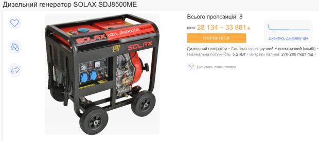 Самой популярной моделью дизельного генератора является SOLAX SDJ8500ME мощностью 5,2 кВт. В среднем это устройство стоит 32 130 гривен и потребляет 0,3 литра дизельного горючего на 1 кВт-ч – 16,66 гривны. Это почти в четыре раза выше тарифа для населения.