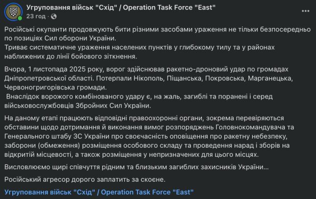 Стоит отметить, что ранее группировка войск "Восток" сообщала о погибших и раненых военных в результате российско-дроновой атаки на Днепропетровскую область 1 ноября.