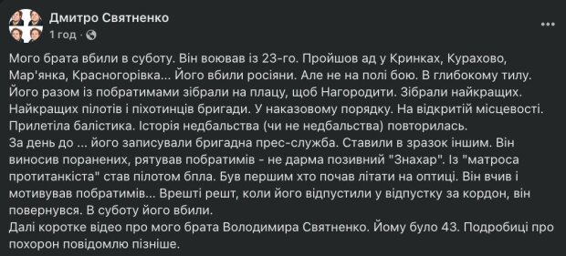 "Собрали лучших. Лучших пилотов и пехотинцев бригады. В приказном порядке. На открытой территории. Прилетела баллистика. История халатности (или не халатности) повторилась", - написал Святненко.
