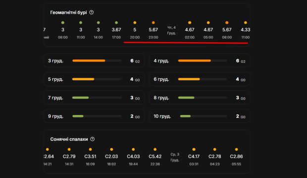 Згідно прогнозів вчених лише перша половина доби 4 грудня відзначиться відчутними геомагнітними збуреннями, які можуть вплинути на самопочуття метеозалежних людей, а далі нас очікують більш спокійні геомагнітні умови, які зберігатимуться і протягом 5-6 грудня, коли Кр-індекс перевабуватиме в межах 4-х балів (помаранчевий рівень).