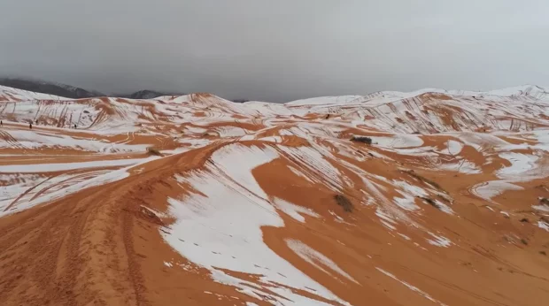 На півночі Сахари випав сніг - температура у пустелі опустилася до -2°C, а на окремих ділянках навіть до -3°C. Це справді рідкісне і видовищне явище! Хоча Сахара асоціюється зі спекою, взимку на її північних територіях (особливо в регіоні Айн-Сефра в Алжирі) холодні повітряні маси іноді спричиняють справжні снігопади. Про це пише Стіна, посилаючись на першоджерело.