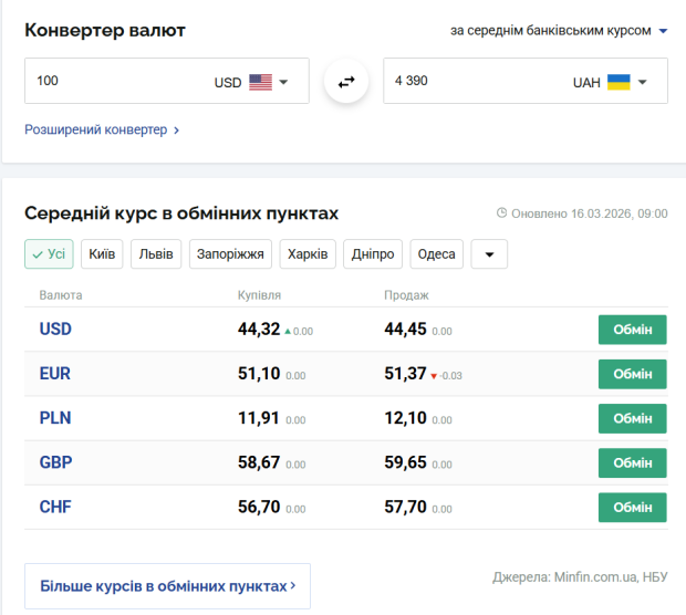Курс валют в Україні станом на 16 березня 2026 року
