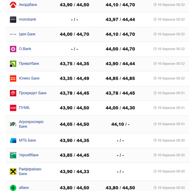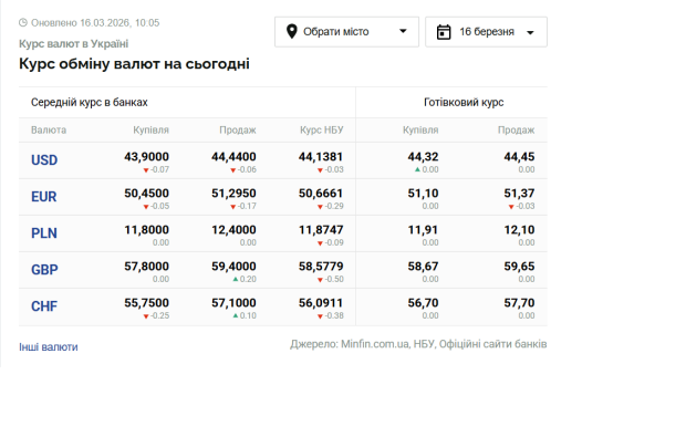 На сьогодні, 16 березня, курс валют в Україні такий: