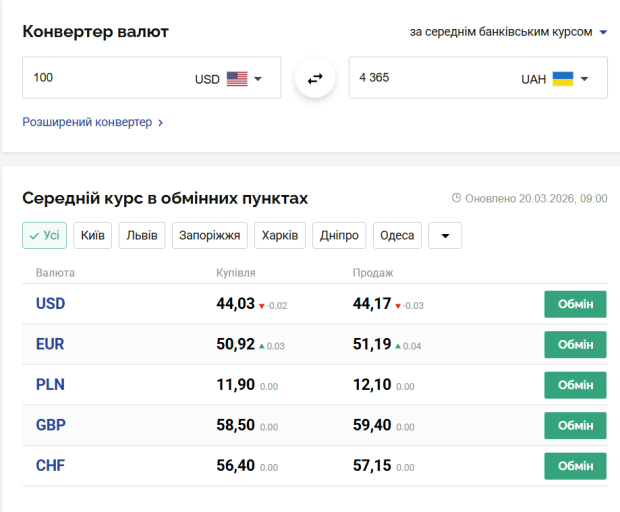 На 20 березня 2026 року Національний банк України встановив офіційний курс долара на рівні 43,96 грн, що на 7 копійок вище попереднього показника. Євро, навпаки, незначно подешевшало — до 50,50 грн.