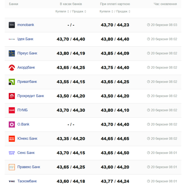 На сьогодні, 20 березня, курс валют в Україні такий: