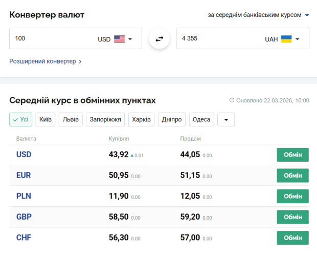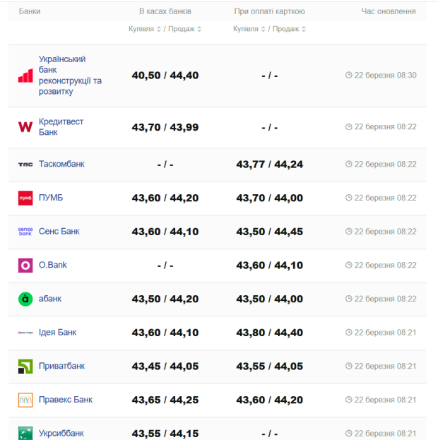 - У касах банків курс купівлі становить близько 43.50 грн, продажу — 44.20 грн.