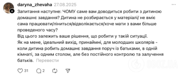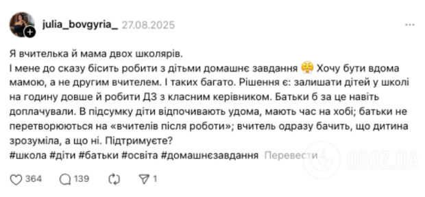 "Я вчителька й мама двох школярів. І мене до сказу бісить робити з дітьми домашнє завдання. Хочу бути вдома мамою, а не другим вчителем. І таких багато. Рішення є: залишати дітей у школі на годину довше й робити ДЗ з класним керівником. Батьки б за це навіть доплачували. В підсумку діти відпочивають удома, мають час на хобі; батьки не перетворюються на "вчителів після роботи"; вчитель одразу бачить, що дитина зрозуміла, а що ні", – написала Бовгиря.