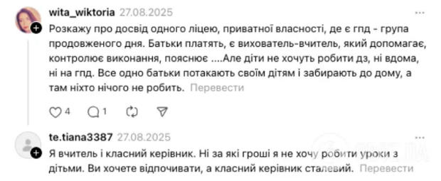 Українці розділилися у поглядах. Так, деякі з них казали, що батьки не зобов'язані робити домашнє завдання з дітьми, а можуть лише його перевірити чи допомогти. Крім того, не всі вчителі хочуть після уроків додатково займатися з учнями, адже теж хочуть відпочивати.