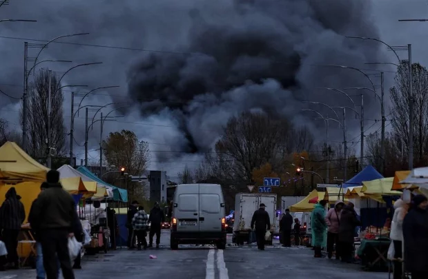 Не дивлячись на війну, продовольчий ярмарок у Києві за розкладом - кадри як з апокаліпсису. Люди на закупках, а на фоні клуби диму від пожеж.