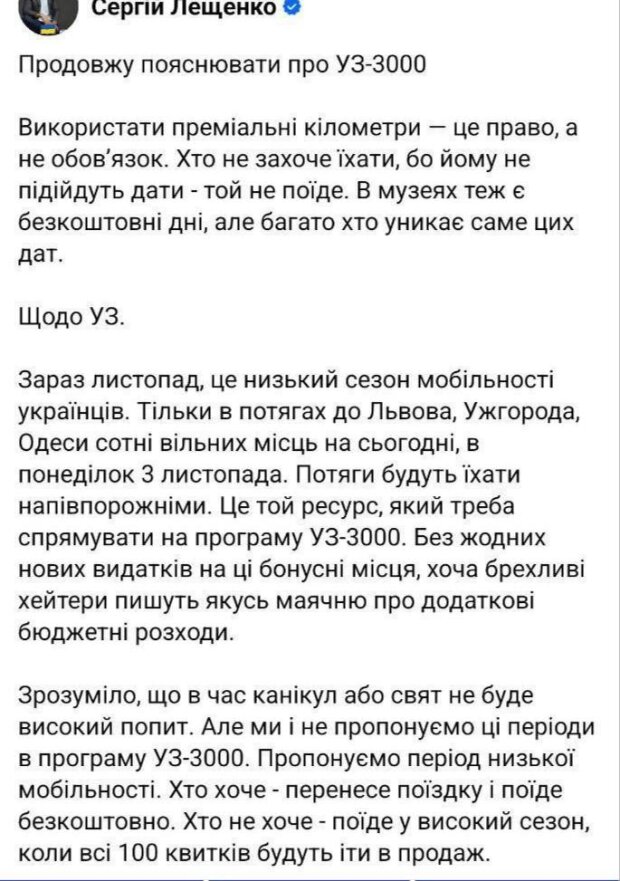 "Потяги будуть їхати напівпорожніми. Це той ресурс, який треба спрямувати на програму УЗ-3000. Без жодних нових видатків на ці бонусні місця, хоча брехливі хейтери пишуть якусь маячню про додаткові бюджетні розходи", - написав Лещенко.