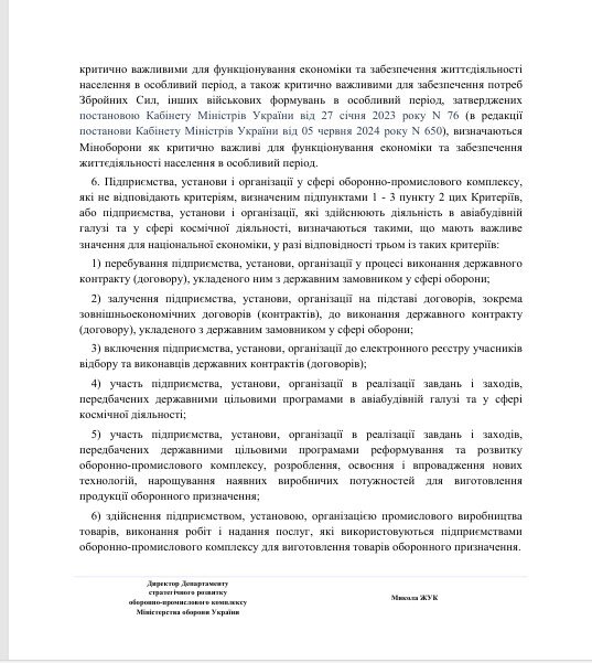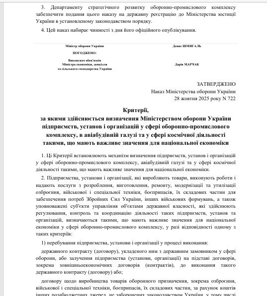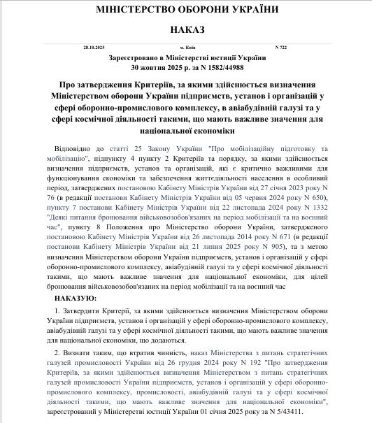 Міністерство оборони України наказом від 28.10.2025 №722 затвердило Критерії, за якими здійснюється визначення підприємств, установ і організацій у сфері оборонно-промислового комплексу, авіабудівній галузі та у сфері космічної діяльності такими, що мають важливе значення для національної економіки.