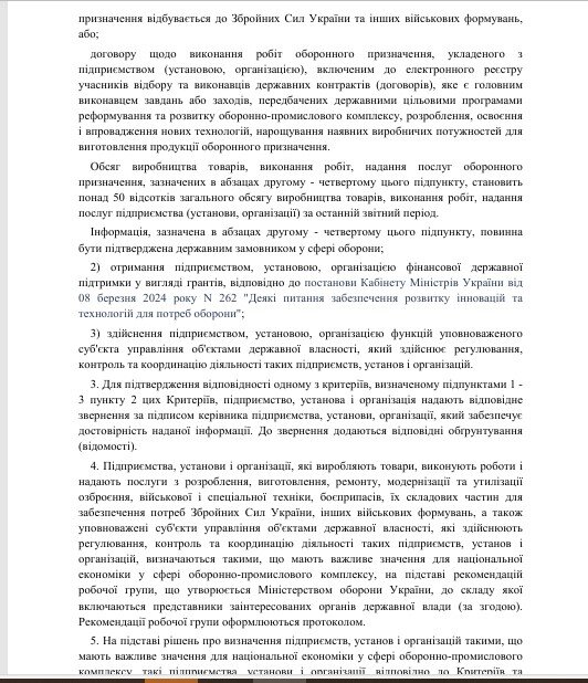 Згідно з наказом, до таких підприємств належать виробники товарів, виконавці робіт і надавачі послуг із розроблення, виготовлення, ремонту, модернізації чи утилізації озброєння, військової та спеціальної техніки, боєприпасів і їх складових частин для забезпечення потреб Збройних Сил України та інших військових формувань.