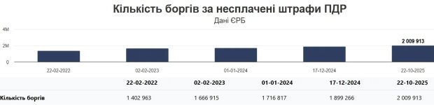 Загалом в Україні зафіксовано 2 009 913 штрафів за порушення ПДР, що на 6% більше, ніж наприкінці 2024 року, повідомляє Опендатабот.