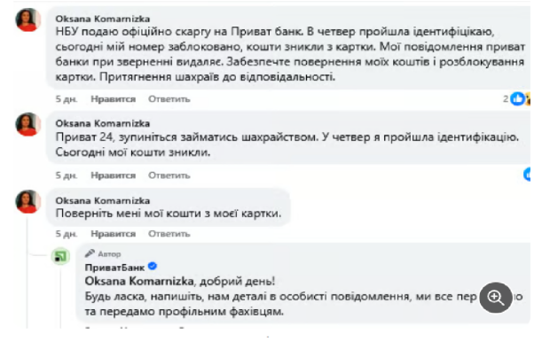 "В четвер пройшла ідентифікацію, сьогодні мій номер заблоковано, кошти зникли з картки. Мої повідомлення ПриватБанк при зверненні видаляє. Забезпечте повернення моїх коштів і розблокування картки...", — йдеться у повідомленні.