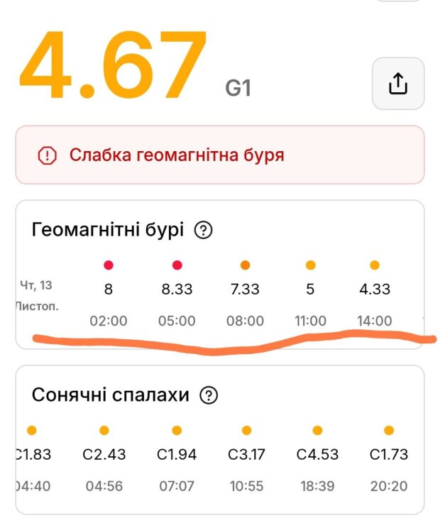 Після полудня інтенсивність бур поступово знизиться до 3–4 балів, проте надвечір можливе нове піднесення до 5 балів. Експерти також відзначають високу ймовірність сонячних спалахів, які можуть посилювати магнітні збурення.