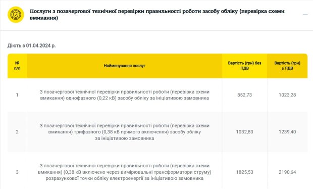• послуга з позачергової технічної перевірки правильності роботи (перевірка схеми вмикання) трифазного (0,38 кВ прямого включення) засобу обліку за ініціативою замовника - 1239,40 грн (з ПДВ);