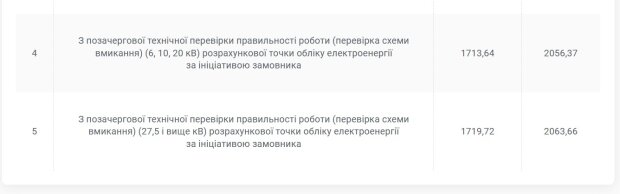 • послуга з позачергової технічної перевірки правильності роботи (перевірка схеми вмикання) (6, 10, 20 кВ) розрахункової точки обліку електроенергії за ініціативою замовника - 2056,37 грн (з ПДВ);