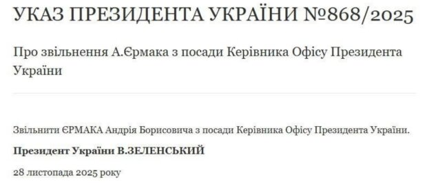 Офіційний сайт Офісу президента України оприлюднив указ про звільнення Андрія Єрмака з посади керівника ОП. Документ підписав президент Володимир Зеленський. За словами глави держави, Єрмак особисто подав заяву про відставку, а найближчим часом у структурі ОП розпочнеться масштабне перезавантаження.